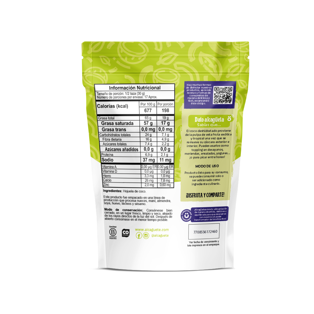 Nuestras hojuelas de coco orgánico son perfectas para darle un toque tropical y nutritivo a tus desayunos, snacks o recetas favoritas. 100% orgánicas, con un sabor auténtico e incomparable que te conecta con lo natural.