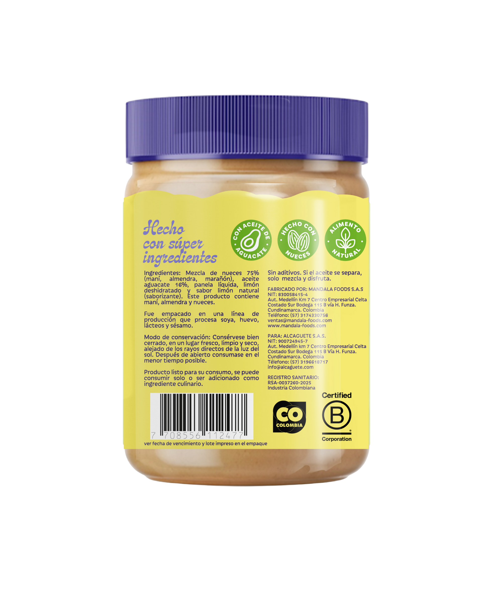 Nuestro spread Lima Limón es una mezcla audaz y deliciosa que combina el sabor cítrico de frutas deshidratadas con la suavidad de nueces y el toque saludable del aceite de aguacate 100% colombiano. Sin gluten, sin trucos, solo ingredientes reales que elevan tus momentos de sabor.